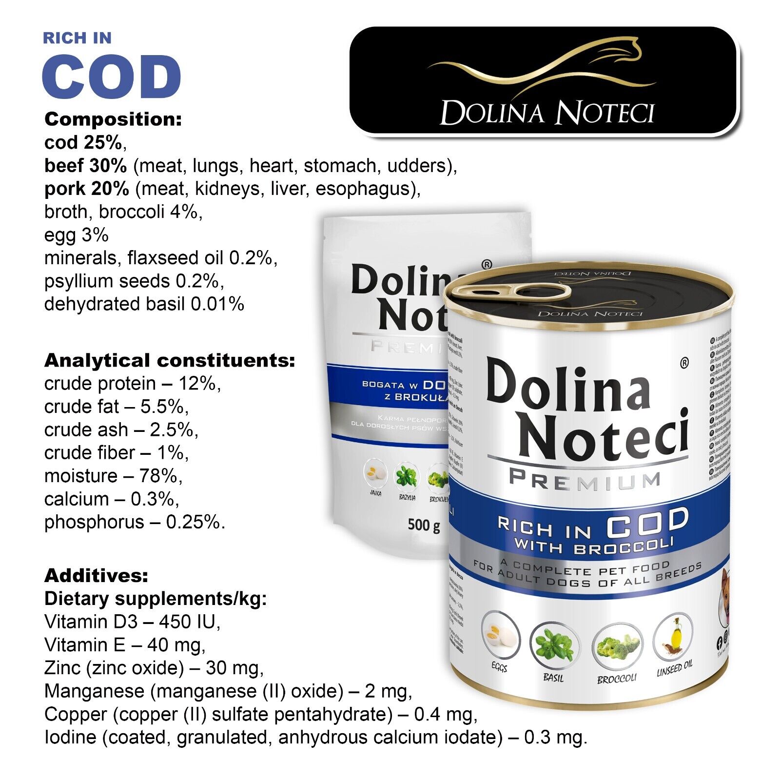 Give your dog the very best – a nutritious wet food that not only tastes amazing but also supports their health and happiness every day. Choose Dolina Noteci Premium Wet Dog Food with Cod and Broccoli and invest in your pet’s future well-being!