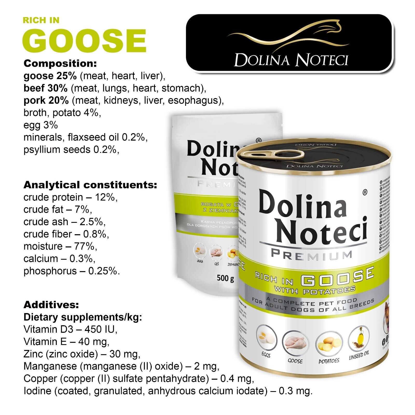 Give your dog the very best – wet food that combines exceptional taste with health benefits. Choose Dolina Noteci Premium Wet Dog Food with Goose and Potatoes and see the positive impact it has on your pet’s well-being.