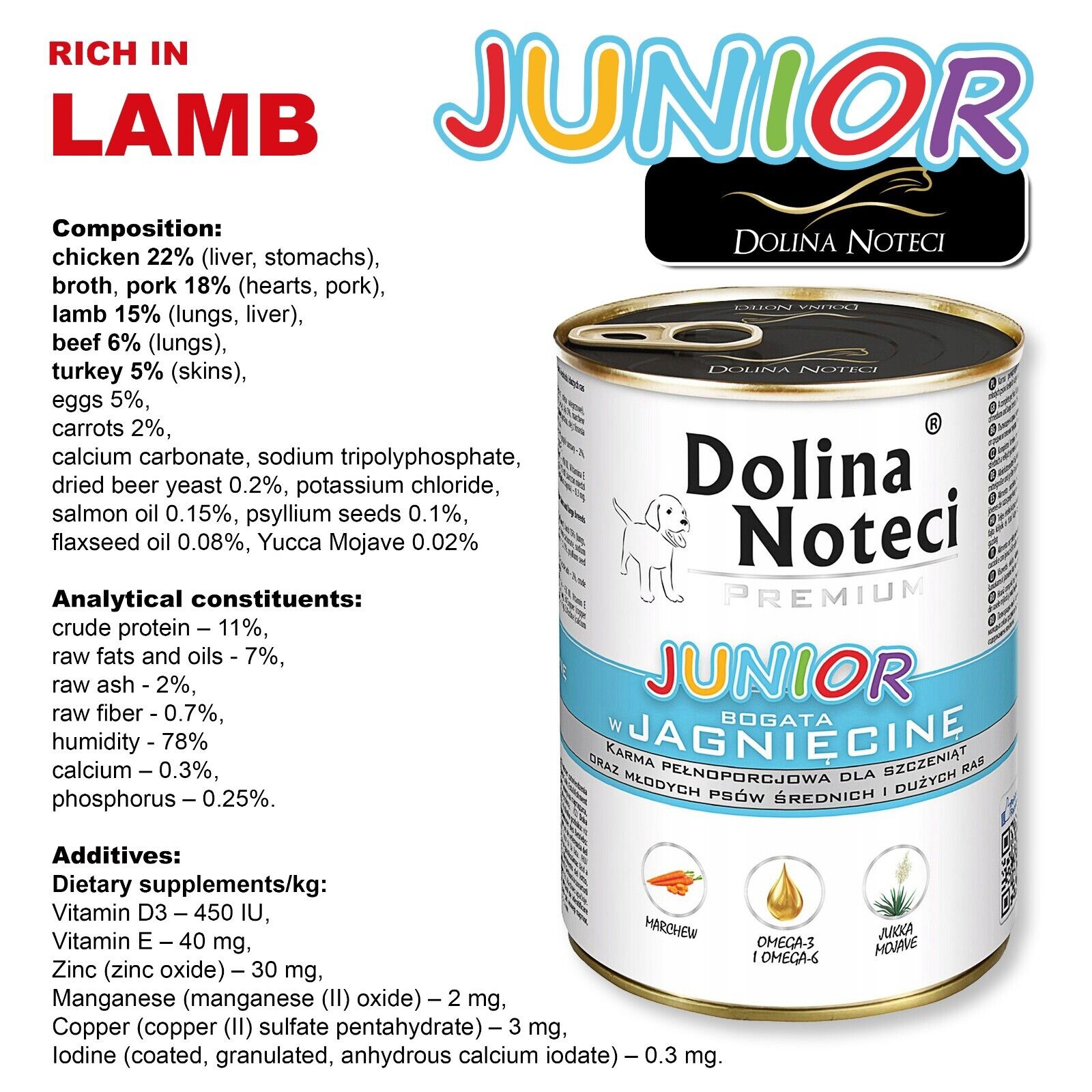 Give your puppy the best start in life with Dolina Noteci Premium JUNIOR wet food rich in lamb. This high-quality food provides essential protein, unsaturated fatty acids, and minerals that are vital for healthy growth and vitality in young dogs.