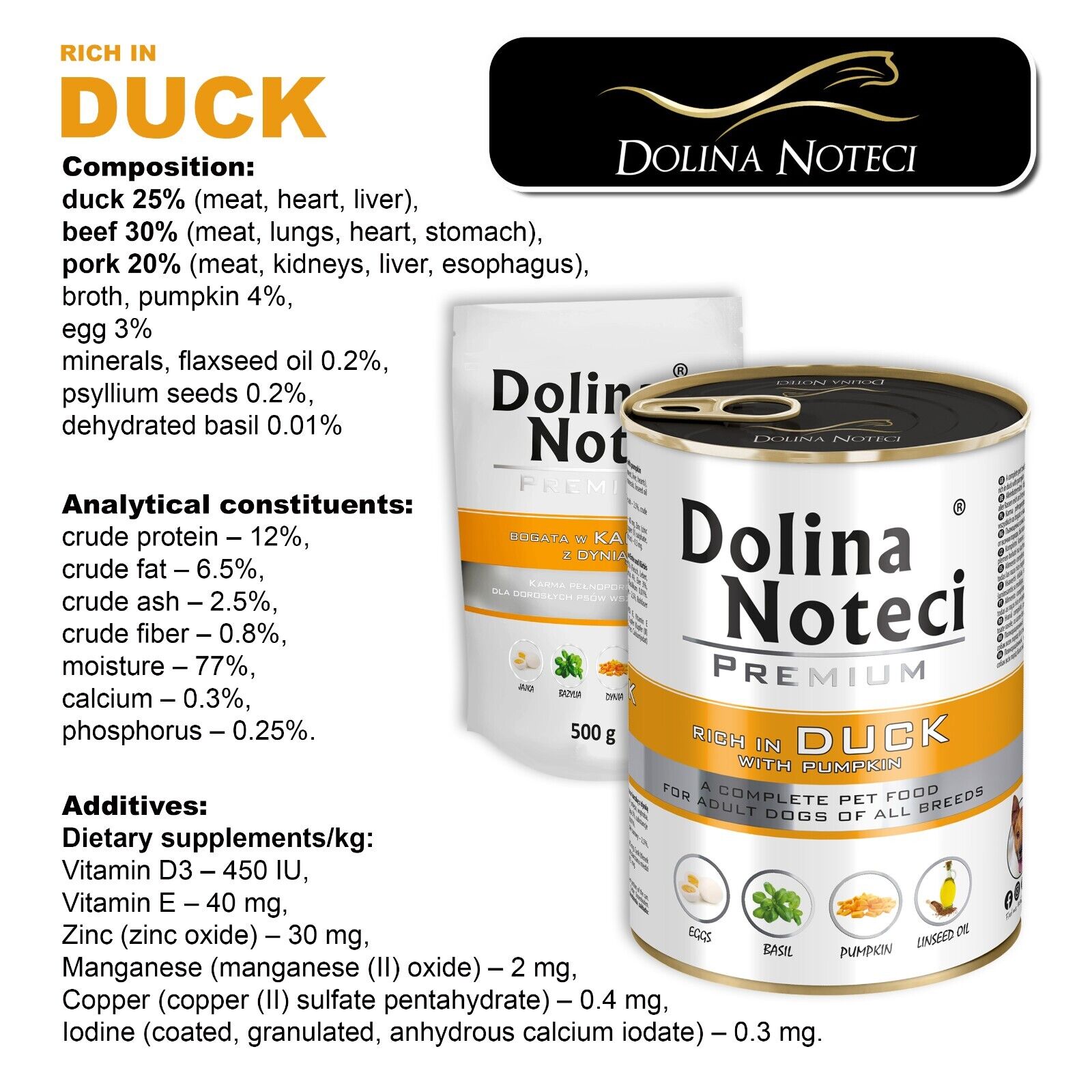 Take care of your dog’s health with Dolina Noteci Premium rich in duck and pumpkin. This complete and nutritious wet food combines exceptional taste with high-quality ingredients, supporting your dog’s overall well-being and vitality every day.