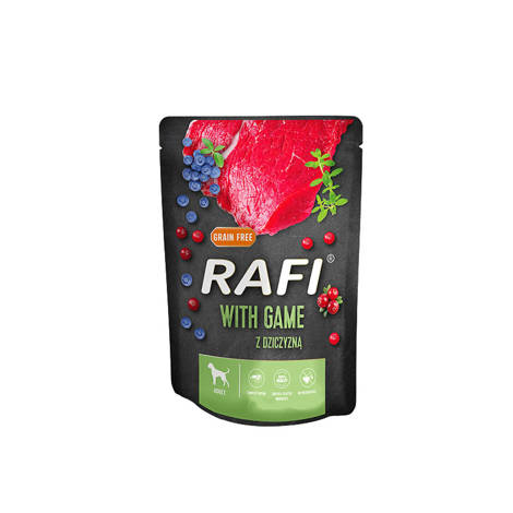 Rafi with Game is a wet food designed for adult dogs of all breeds. It combines a high content of quality protein with low-fat levels, making it an excellent option for healthy and balanced nutrition. Game meat provides not only valuable protein but also lysine and histidine, which are essential for supporting your dog’s health and vitality.